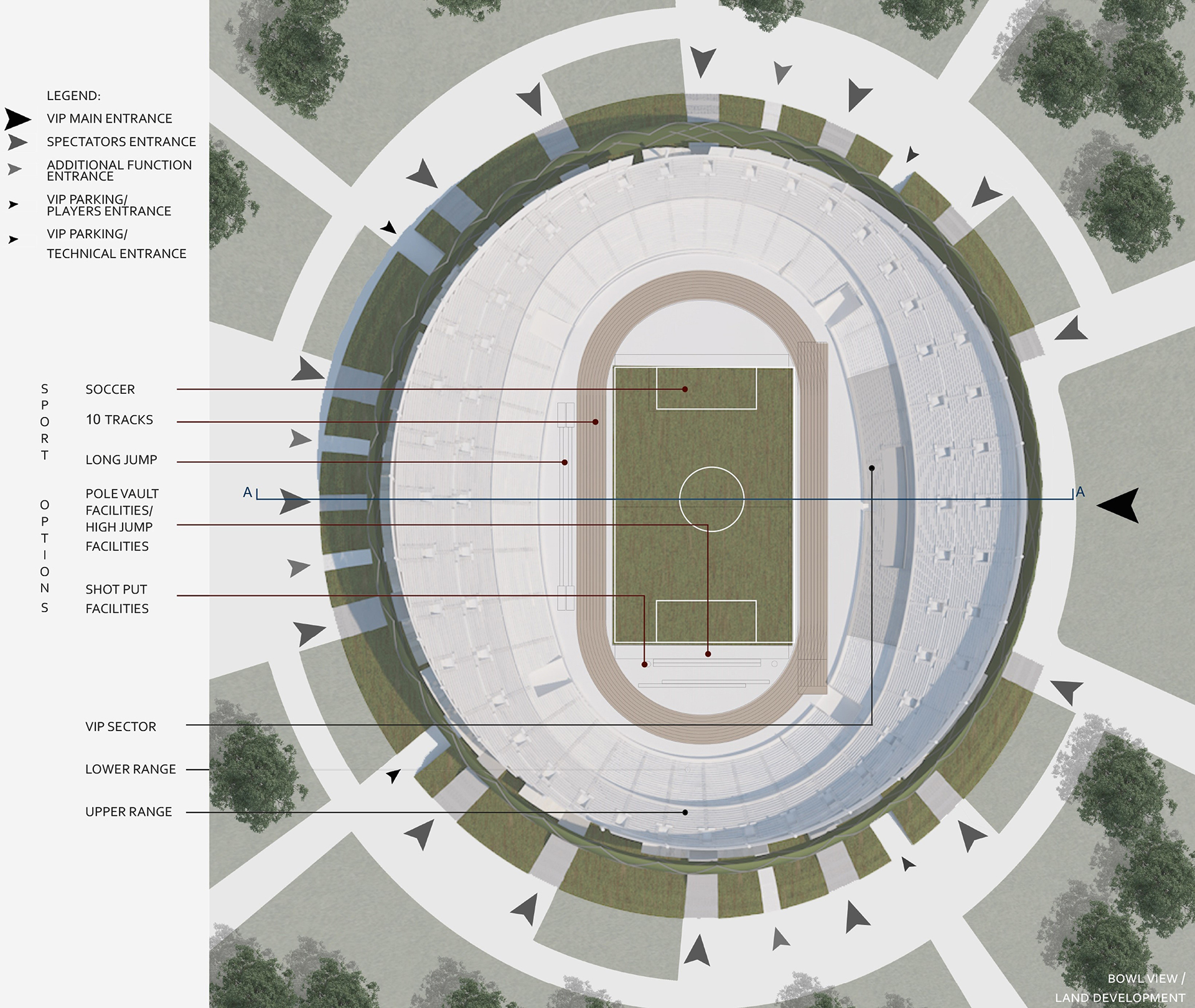 Stadion zaprojektowano jako budynek multifunkcjonalny z przeznaczeniem dla ponad 40.000 widzów. Na stadionie odbywać się mogą zawody lekkoatletyczne, mecze piłki nożnej oraz rugby, treningi a także koncerty. Obiekt wyposażony jest w zaplecze niezbędne do organizowania różnego typu wydarzeń. Na terenie stadionu znajduje się strefa VIP oraz biznes, zaplecze edukacyjne dla młodych sportowców, miejsca spotkań oraz organizacji wydarzeń kulturalnych dla mieszkańców. Każda z wyżej wymienionych funkcji może działać niezależnie od siebie.
